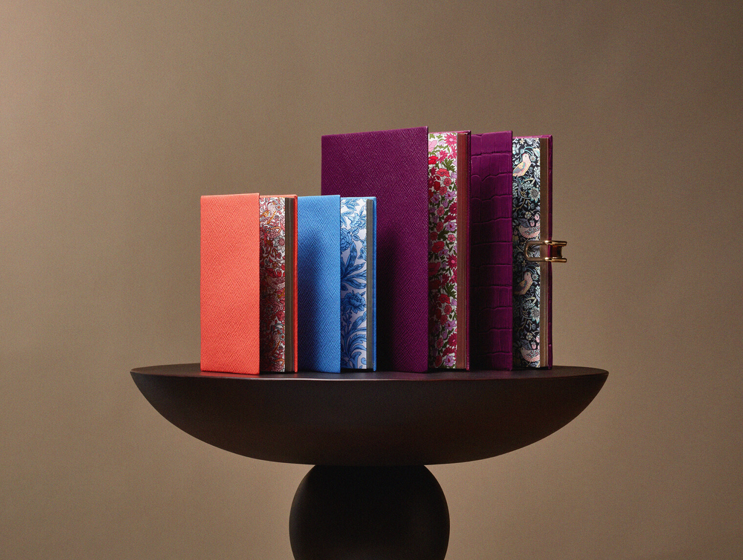 カラーは リバティを代表する「パープル」、スマイソンのブランドを象徴する「ナイルブルー」、そして今季限定の「コーラル」を揃え、それぞれの色に合わせたリバティのアイコニックなフラワープリントによるシルク生地でライニングを施しています。