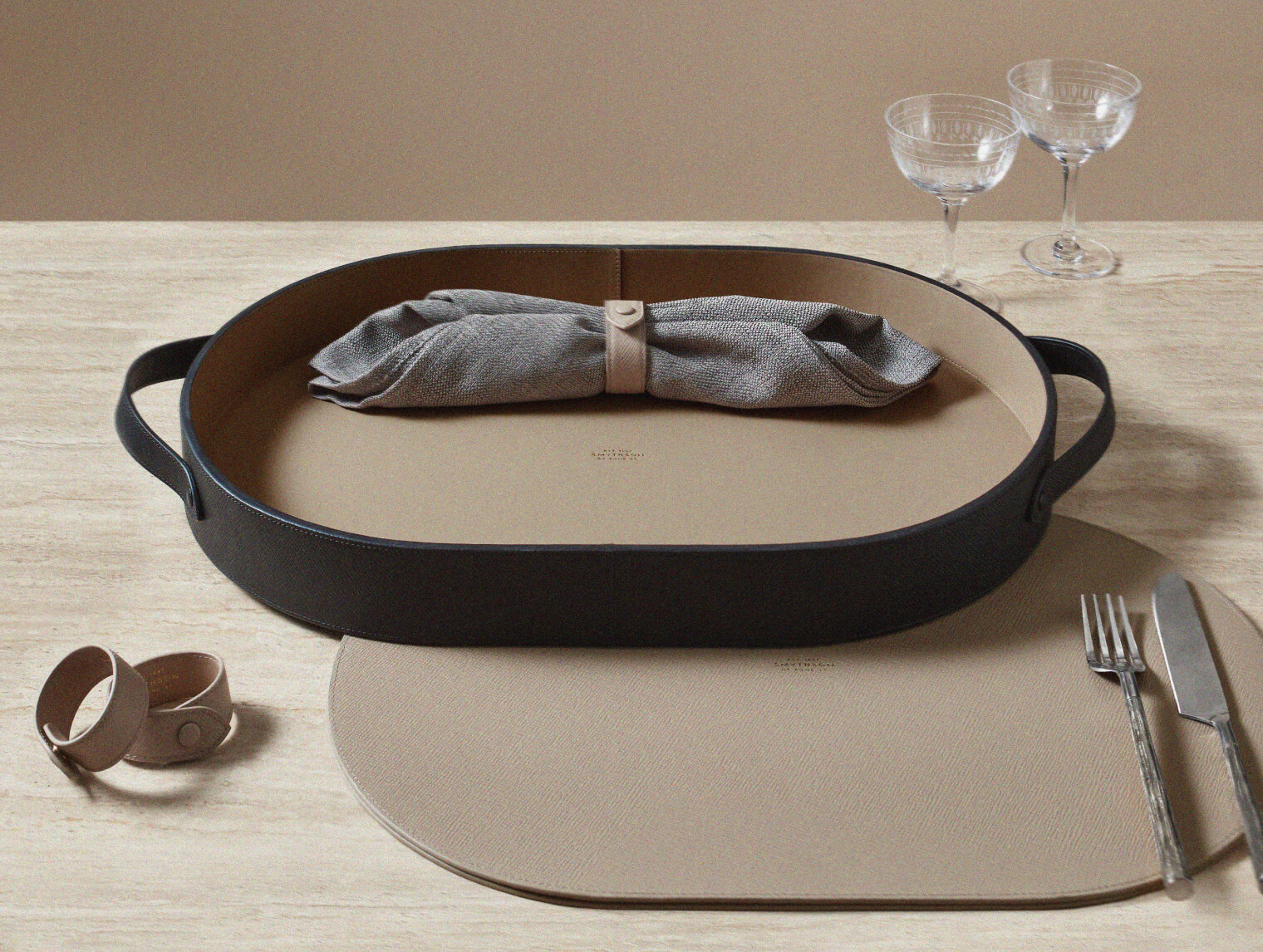 パナマレザーで仕立てた新作のホームコレクションは、日常の食卓に上質な彩りを添えます。サービングトレイはインテリアのアクセントとしても映え、ゲストを迎えるカクテルアワーにも自然に溶け込みます。