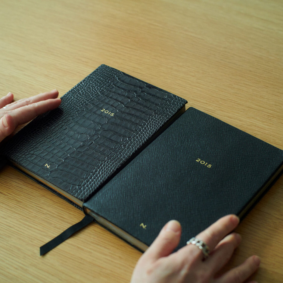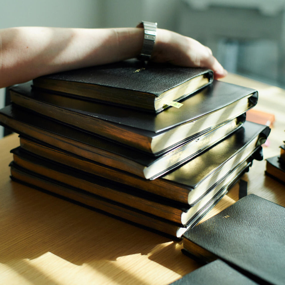 色は決まって黒。完売で仕方なくオレンジを選んだ一年をのぞき、黒革にゴールドの縁取りが施された手帳がずらりと並ぶ。