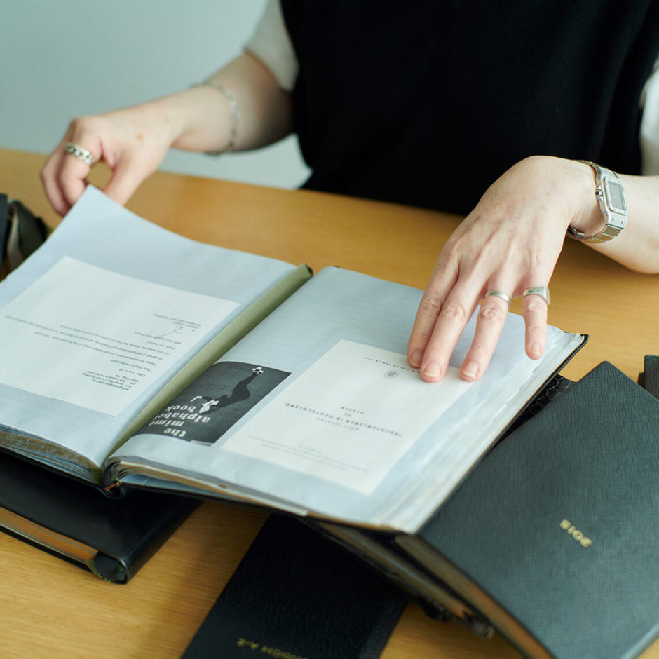 幾冊も積み重ねられた黒表紙のダイアリー。撮影のテストポラロイドや、心惹かれた広告の切り抜き、迷い抜いてカスタムしたピストバイクの写真、時には契約書まで——気になるものを無造作にスクラップした断片に、アートディレクターの平林奈緒美さんの日常とインスピレーションが浮かび上がる。何年もの時間を共にしてきたスマイソン。平林さんは「良いものを知る人へこそ」と想いを込めて、ギフトにも選んできたという。ホリデーシーズンに向けて、デザインのプロフェッショナルに聞いた、スマイソンを贈る理由とは。
