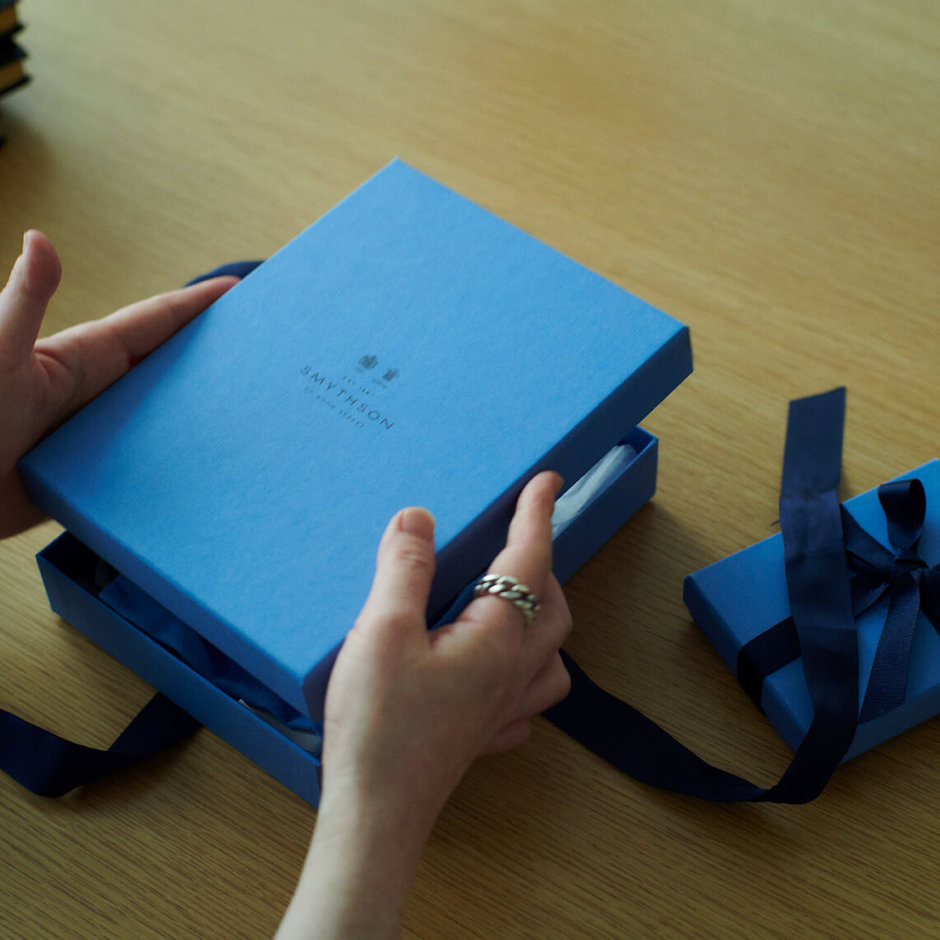 「ロンドンでの生活を終えて帰国する時、友人へのお土産を悩んでいたんです。スタイリストだからアクセサリーを買うわけにもいかないし、ならばスマイソンでレターヘッドと封筒に名前を刻印してもらおうと考えました。いざお店に行くと、贈る相手や用途を事細かに質問してくれて。小さなサイズの便箋と封筒、二つ折りのレターヘッド、メッセージカードの3種をすすめられて作りました。そのセットを、あのナイルブルーのボックスに入れてくれたんです。私がデザイナーだと話すと、奥からビスポークのアーカイブファイルを取り出して見せてくれたりもして。貝殻をすり潰して刻印した昔の技術も美しくて、忘れられない思い出になりました」