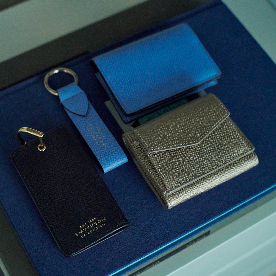大切な想いを託すのに相応しい、タイムレスで洗練されたスマイソンの小物。日々に寄り添うアイテムだからこそ、手にする度に愛着のわく上質なものを贈りたい。いずれも丈夫なグロスグレイレザー製で、パーソナライズの刻印が施せるのでギフトにもぴったりだ。スモールレザーグッズ。
