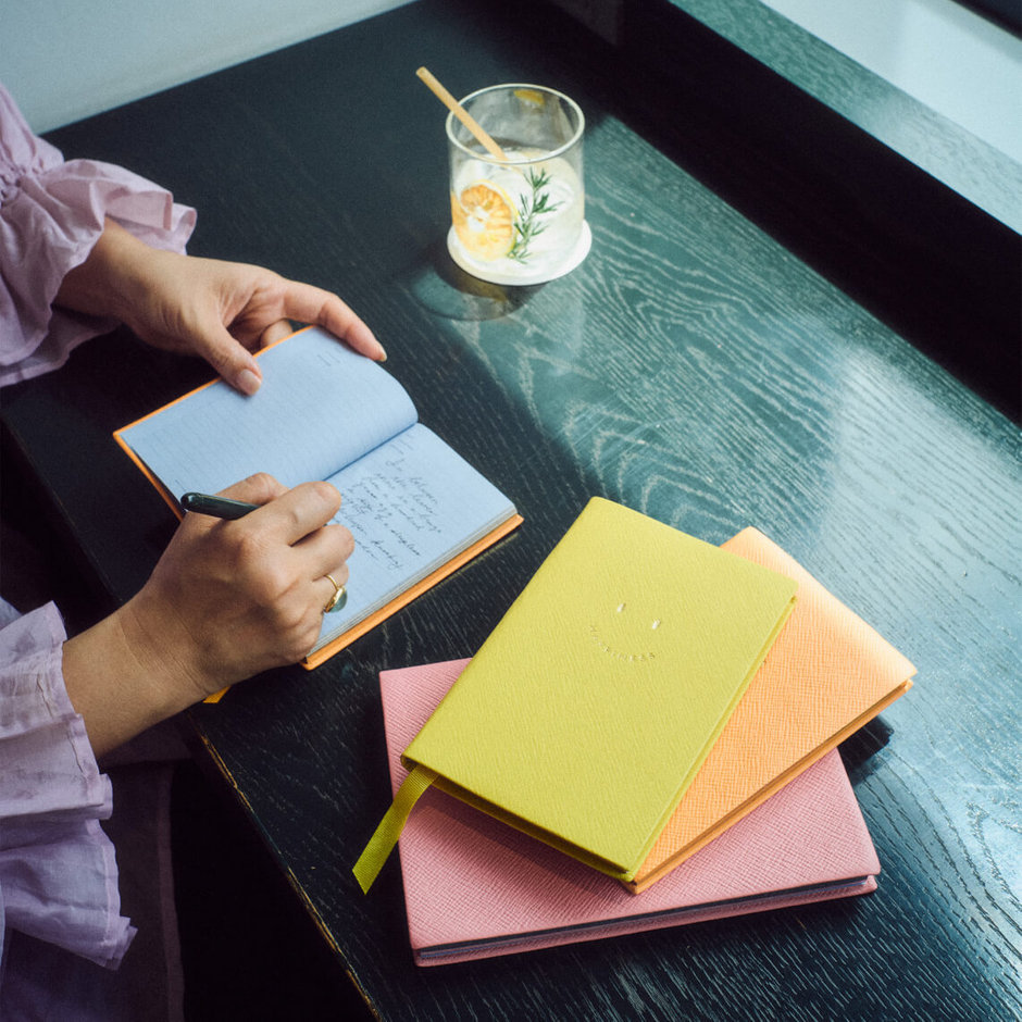 出合いは数年前、友人が手にしていた小さな手帳。上質なレザーに薄いブルーのフェザーウェイト紙。15人以上の職人の手を経て一冊が出来上がる、スマイソンのパナマノートブックの上品さに目を奪われた。 色褪せない記憶。