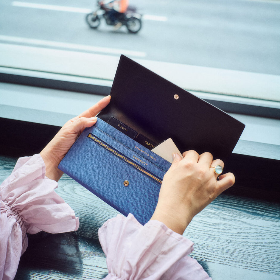 旅じたくも大抵、出発の朝に。必要なものはすぐ手の届くところにまとめてあるので、あっという間に終わるという。そんな旅慣れた坂本さんだが、スマイソンのアイテムは、スマートに収納できるところに惹かれている。ライトオレンジのパスポートカバーをはじめ、フレッシュな春夏のシーズンカラーも印象的だ。